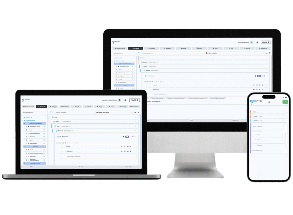 Ankieteo to najbardziej kompleksowy kreator ankiet on-line w Polsce, dzięki któremu w kilka chwil stworzysz swój projekt badawczy z wykorzystaniem wielu różnych (także niestandardowych) typów pytań. To jednocześnie potężne narzędzie umożliwiające tworzenie skomplikowanych scenariuszy badawczych dzięki rozbudowanemu silnikowi obsługującemu logikę ankiety.